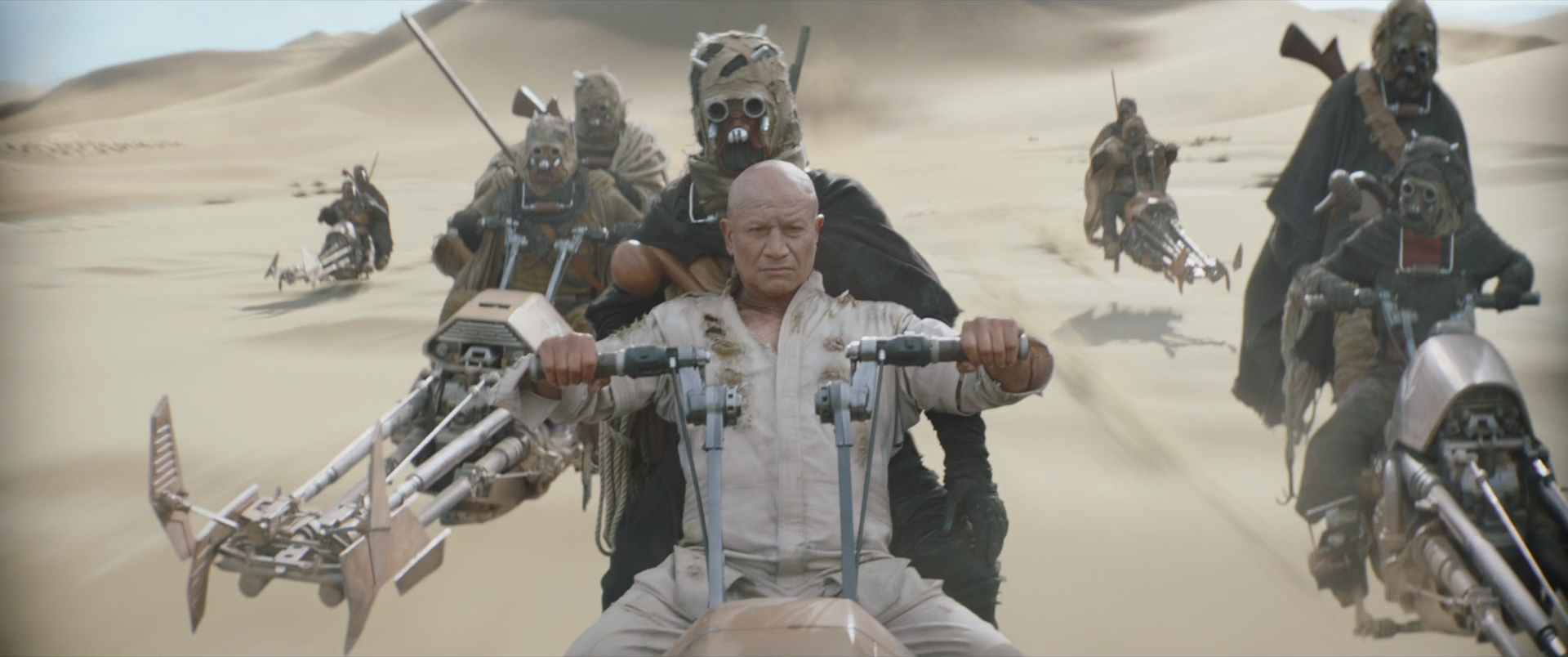 Temuera Morrison as Boba Fett takes a little ride with some Tusken buddies through the Dune Sea in ‘The Book Of Boba Fett’ Season 1 Episode 2: “Chapter 2: The Tribes of Tatooine”.