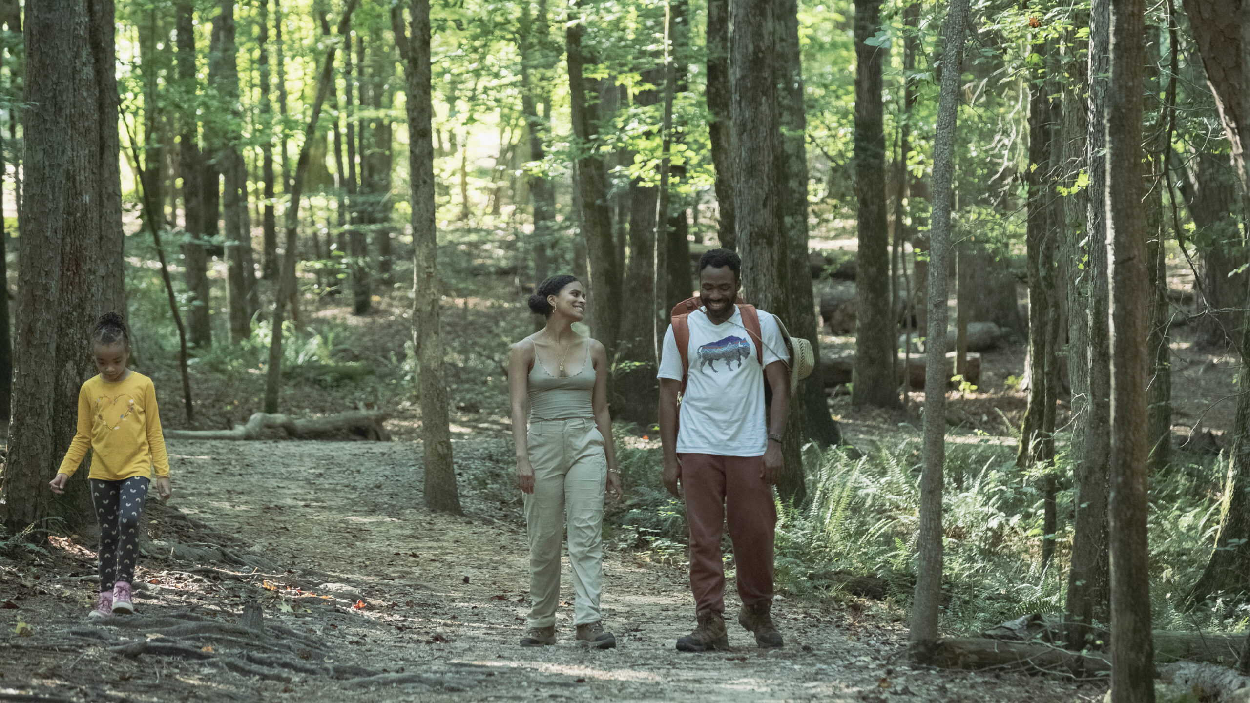 Pictured from left to right: Earnest “Earn” Marks (Donald Glover), Vanessa “Van” Keefer (Zazie Beetz), and their daughter, Lottie (Austin Elle Fisher), have a picnic in the woods in Donald Glover’s surreal comedy-drama series, ‘Atlanta’ Season 4 Episode 7—”Snipe Hunt”. Photo credit to Guy D’Alema/ FX.